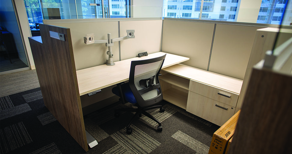 The stations are powered at the panel base and also include a clamp mounted power module on the height adjustable surface, making power easily accessible to the user. The Switch fabric panels used in this project are 50”H, and include a 8”H clear tempered glass panel top mounted screen, along with 50”H laminate gallery panels for the wings in a beautiful vertical wood grain.