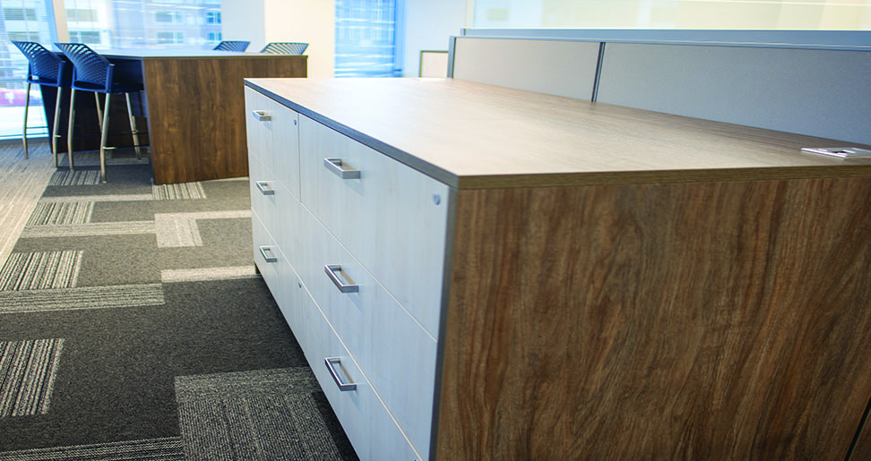Although the project is primarily Switch, it is sprinkled with some amazing Scene storage. Multiple storage options featuring carefully considered details provide the optimal user experience in this workspace. The Scene storage includes a low combo credenza, and a custom 12”W wardrobe tower, featuring the standard Scene metal foot detailing.