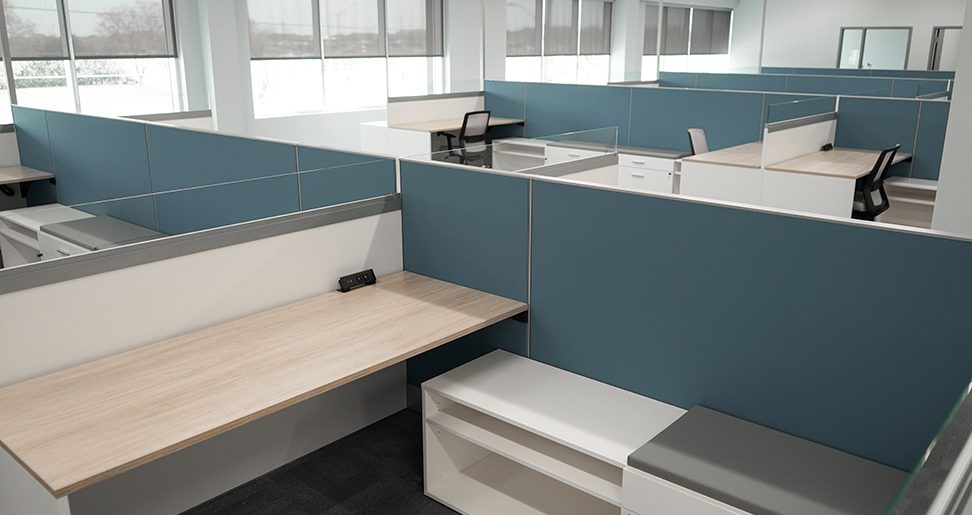 In the open office, Amphenol required each station to have storage and ample work surface space. To keep the light modern feel, credenzas with white cabinets were installed for storage. Each workstation was specified in Mojave laminate, Cyan Blue fabric panels with silver trim, and gallery panels in white laminate. Transitions also specified the clamp on the power module, allowing easy access for laptops and phone charging.