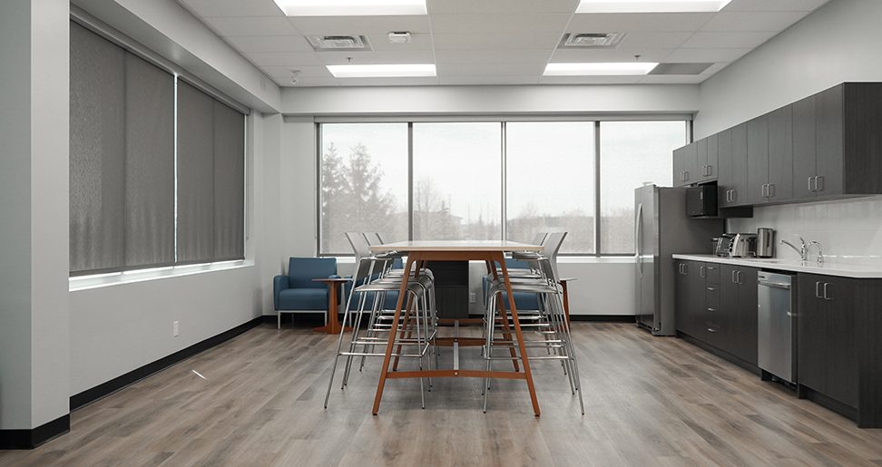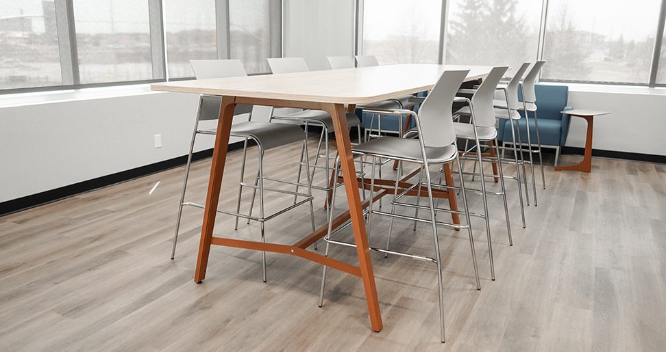 Finally, three collaboration tables were installed, including one 12-foot-long Halifax table in matching Mojave laminate and Cooper metal finishes installed in the Bistro, and two Norris boardrooms in complimentary Megantic laminate in the meeting rooms. These tables encourage additional collaboration and teamwork while maintaining a modern and timeless appearance.