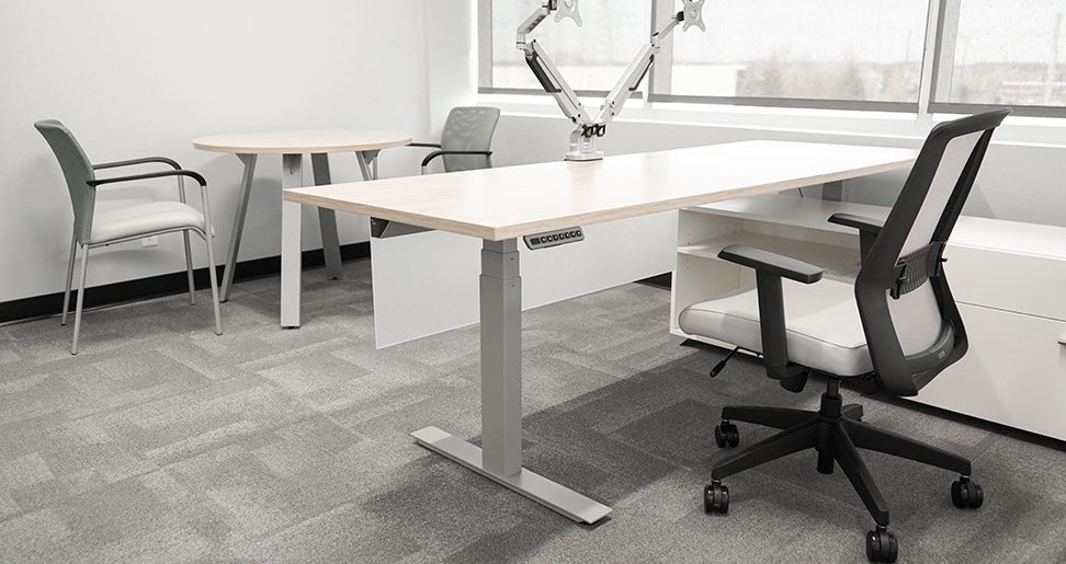 To provide a cohesive look, the Scene private offices were installed in white laminate, each with a large credenza cabinet, silver dual monitor arms, and Volley height-adjustable desks. The private offices offer ample storage options and extra flexibility and comfort.