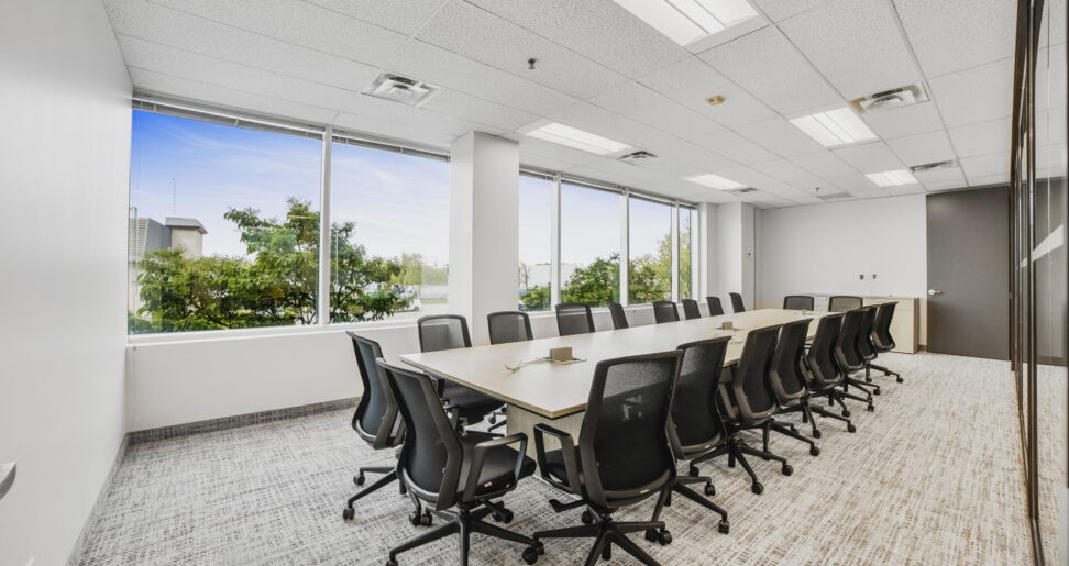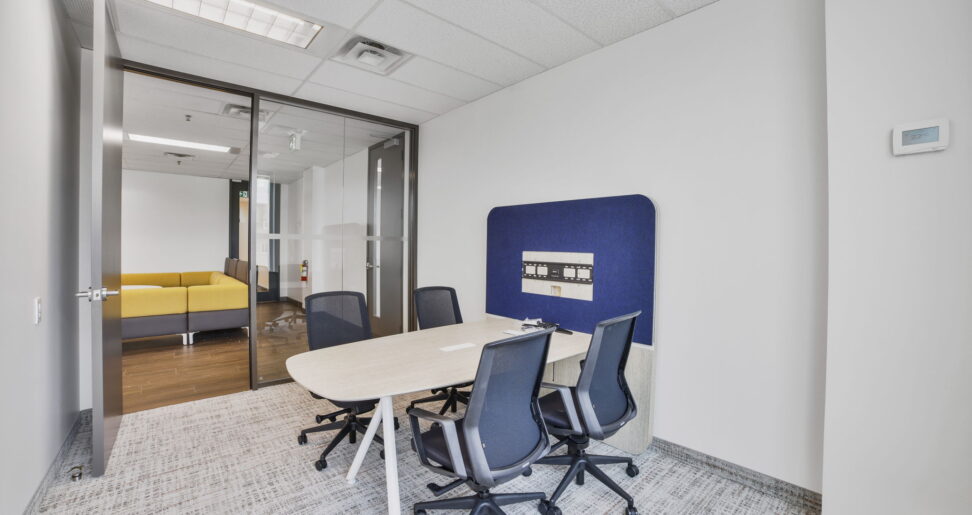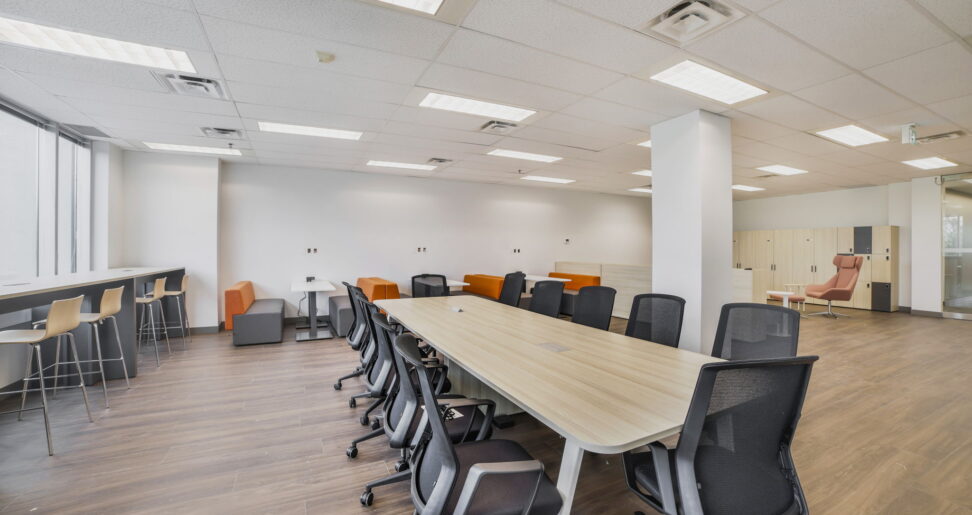 Beyond the lounge, dedicated collaboration zones were integrated into the layout to support more structured meetings and group discussions. A 120″ Metro professional boardroom table and Halifax video-shaped meeting tables with integrated power serve as high-performance hubs for internal strategy sessions and virtual engagements with external stakeholders. The consistent use of Tayco’s design-forward products throughout these spaces allows for seamless transitions between casual conversation and focused teamwork.