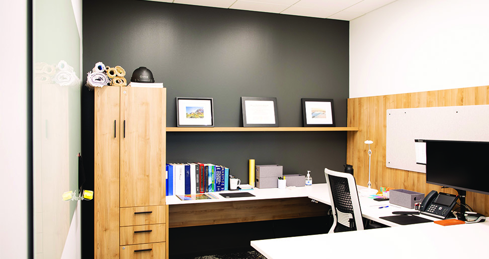 The workstations and private offices utilize Tayco furniture and feature height adjustable desks, storage towers including a closet and box file, tack boards, and ample desk space. The private offices have additional storage, floating shelves, larger tack boards, and a white board to write down ideas. Goree has been a longtime customer of Tayco and uses their products in many of their retail automotive facility designs. When the Wells Group recommended Tayco products for the office remodel it was a no brainer. Tayco helped early in the process to take the original design aesthetic and translate it using the appropriate Tayco products.