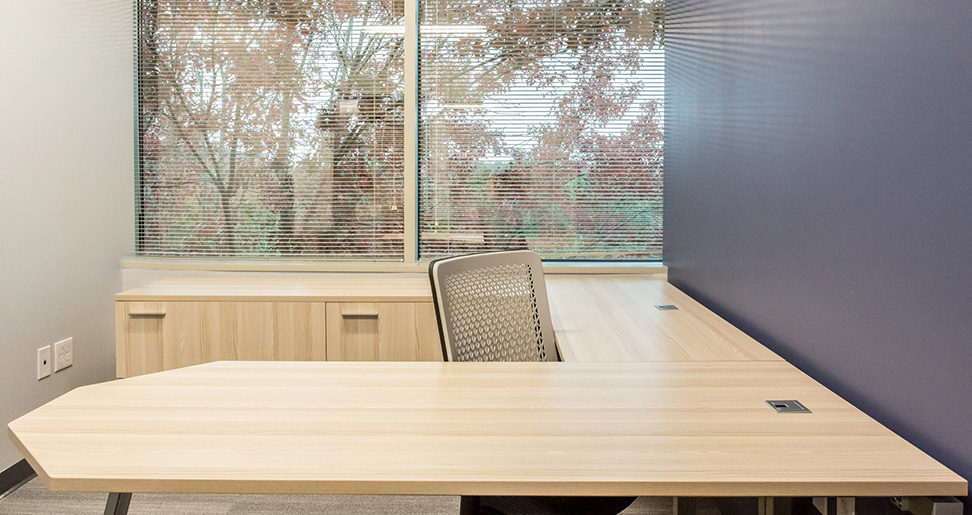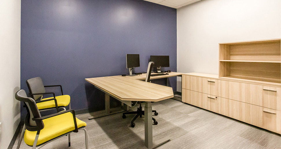 The office now features silver trim throughout, with Acacia laminate used in both the Switch stations and Scene private office spaces to create a sleek, refined atmosphere. Brand associated style has been added through a single pop of blue in the form of the pedestal cushion for the Up stations and a panel insert for Switch.
