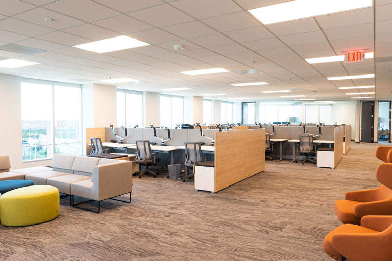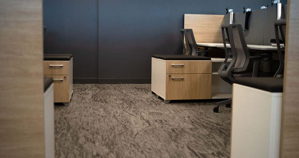 These workstations incorporated two-drawer under-desk credenzas also in White laminate, a cushion option added for additional seating space in sleek Nightfall fabric and a multipurpose tackboard in Stone Ballo for both privacy and display functionality. Furthermore, five Metro private offices in White laminate and vinyl accompanied by wall mounted hutches with sliding doors in Mojave laminate and matching vinyl were added for extra capacity.