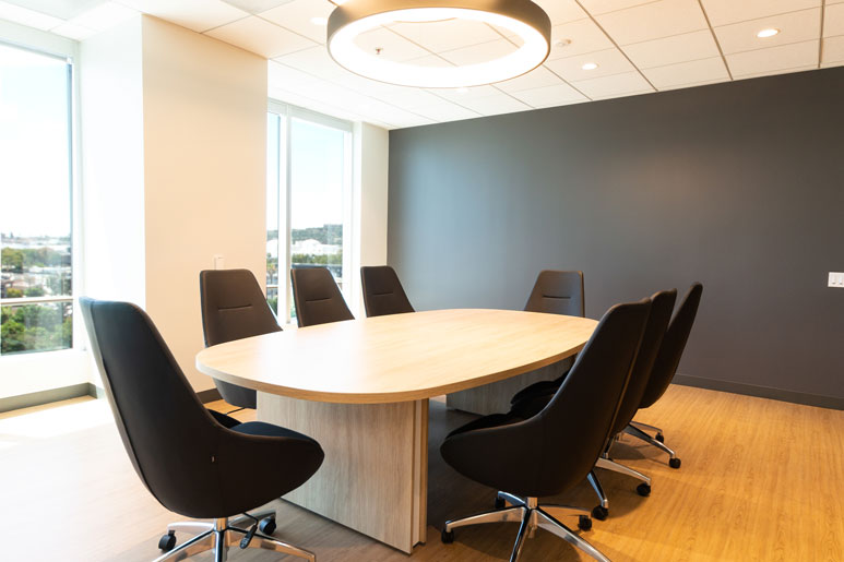 The project additionally incorporated four private meeting rooms equipped with Norris boardroom tables of straight and oval shapes, all crafted from Mojave laminate. Complementing these tables were matching laminate and vinyl storage cabinets accented with a sleek Brooklyn handle in Silver.