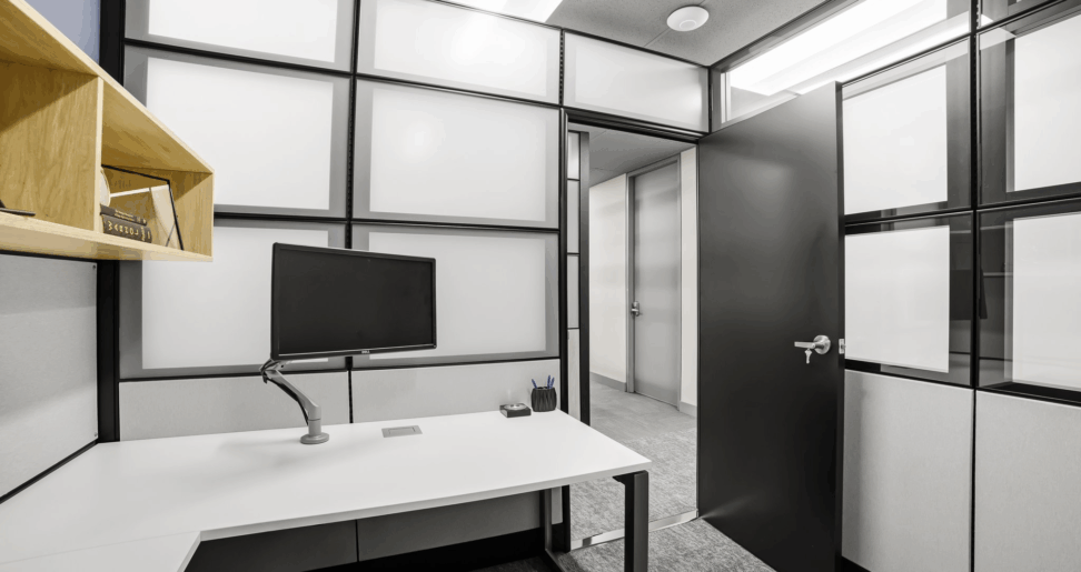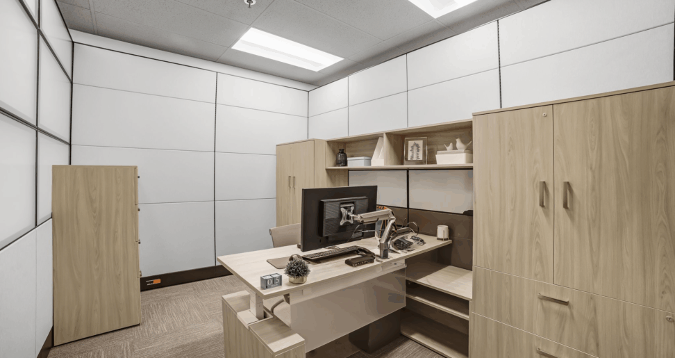 One of the most significant challenges in redesigning the space was finding smart, intentional configurations that would allow every square foot to serve multiple functions: supporting impromptu meetings, individual focus work, and visits from out-of-town Team members, without the office ever feeling too busy or overcrowded. The main area of the office was carefully planned to accommodate a high volume of employees with diverse working styles. For fixed setups such as the Manager Stations, Scene workstations in Charcoal Linen laminate were installed, each featuring custom Echo P.E.T. privacy screens.