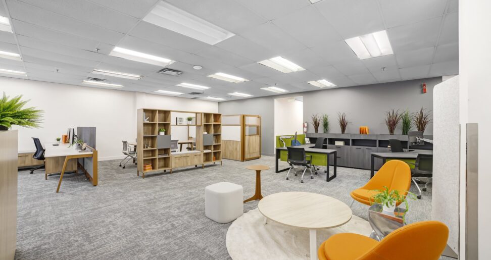 As with any major transformation, the team faced several key challenges—most notably, designing a workspace that effectively supports a hybrid work model. The primary focus was integrating touch down stations to provide Team members with the flexibility to work comfortably and productively during their time in the office. However, limited access to power required strategic planning, with workstations positioned along perimeter walls to leverage existing infrastructure. At the same time, the space needed to serve a dual purpose: meeting employee needs while showcasing Tayco’s full product offering in real-world, functional settings for Client visits.