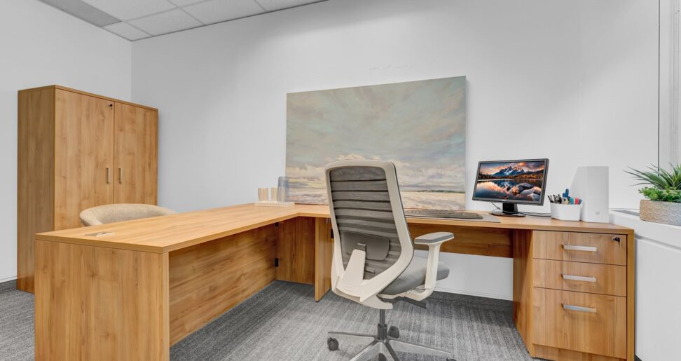 To encourage employees to return from home to the office, 22 private offices were thoughtfully curated and designed with a home-like feel, creating a welcoming environment. Using a combination of Halifax, Metro and custom items, each office demonstrated a feeling of individuality while also matching the office design. Freestanding desks and straight tables with modesty panels provided practical yet stylish work surfaces, while PET Felt Walls in Overcast offered sound-dampening and a modern touch. Storage needs were addressed with freestanding cabinets, low credenzas, and wardrobe cabinets with coat bars, ensuring employees had everything they needed within reach. An overall seamless aesthetic unified the entire office, with consistent finishes in Tofino melamine and vinyl used across all furniture, from reception to private offices. This cohesive design contributed to a calming, professional atmosphere that reflected the law firm’s values. The choice of neutral, serene colours helped maintain a collected environment while boosting morale and motivation. The result was a workspace that not only met functional needs but also enhanced employee satisfaction and added to the Client’s polished image.