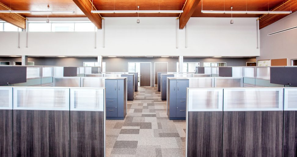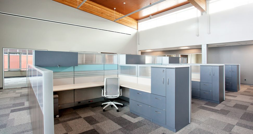 La gamme Cosmopolitan de Tayco, qui contient beaucoup de rangement, a été utilisée pour définir cet espace ouvert. Des panneaux de 135 cm (53 po) et de & 175 cm (69 po) de hauteur permettent à la lumière naturelle d’inonder l’espace tout en offrant assez d’intimité pour mener les activités de l’entreprise.