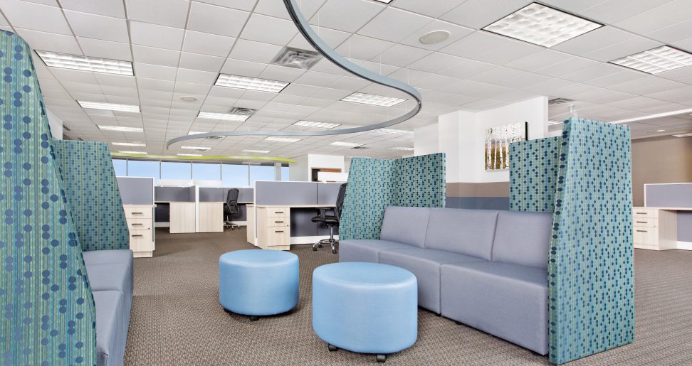 L’Institute for Study Abroad de l’Université Butler déménageait dans de grands locaux ouverts où il y a de la lumière naturelle à profusion. Le client a consulté Tayco pour qu’elle l’aide à transformer l’espace, en créant des postes de travail à la fois efficace et ingénieux qui s’harmonisaient avec sa palette de couleur bleue et verte. Tout en gardant le budget du client à l’esprit, les possibilités pour un bureau moderne étaient presque infinies.