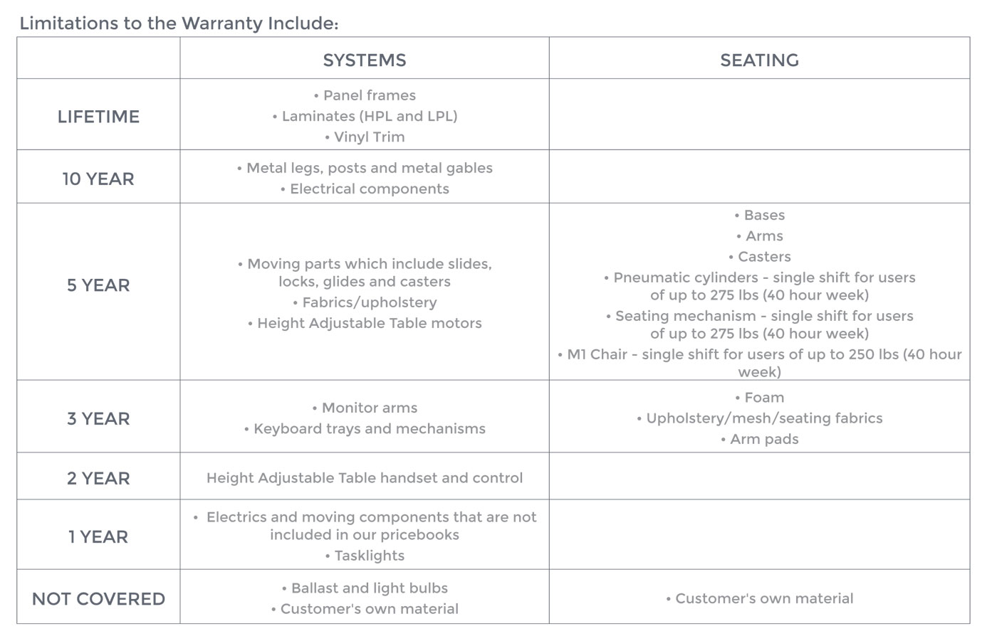 Les produits de Tayco qui font partie de notre offre standard sont visés par une garantie à vie limitée à l’acheteur original, pour le bureau seulement. La garantie, applicable à partir de la date de fabrication, couvre les défauts structuraux et de fabrication avec une usure et un soin normaux des produits. Si le produit est défectueux, et si des avis écrits sur le défaut sont signifiés à Tayco dans la période de garantie applicable, Tayco peut (à sa discrétion) réparer ou remplacer le produit défectueux par une composante ou un produit comparables. Tayco paiera les frais de main-d’oeuvre pour le produit défectueux dans l’année qui suit la date d’achat. Toutes les rétrofacturations de main-d’oeuvre nécessaire à la réparation ou au remplacement des pièces défectueuses DOIVENT être envoyées avec la réclamation et être préapprouvées par Tayco par écrit. Il appartiendra entièrement à Tayco de déterminer ce qu’elle estime raisonnable pour les travaux à effectuer.