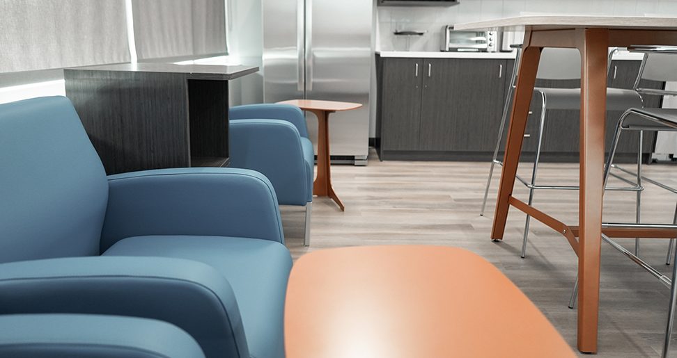 Finally, three collaboration tables were installed, including one 12-foot-long Halifax table in matching Mojave laminate and Cooper metal finishes installed in the Bistro, and two Norris boardrooms in complimentary Megantic laminate in the meeting rooms. These tables encourage additional collaboration and teamwork while maintaining a modern and timeless appearance.