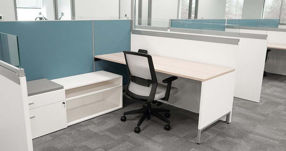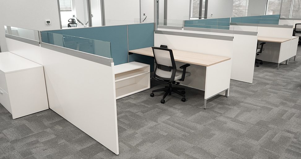 In the open office, Amphenol required each station to have storage and ample work surface space. To keep the light modern feel, credenzas with white cabinets were installed for storage. Each workstation was specified in Mojave laminate, Cyan Blue fabric panels with silver trim, and gallery panels in white laminate. Transitions also specified the clamp on the power module, allowing easy access for laptops and phone charging.