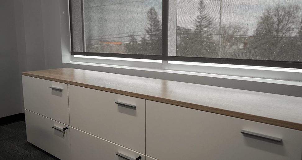 To provide a cohesive look, the Scene private offices were installed in white laminate, each with a large credenza cabinet, silver dual monitor arms, and Volley height-adjustable desks. The private offices offer ample storage options and extra flexibility and comfort.