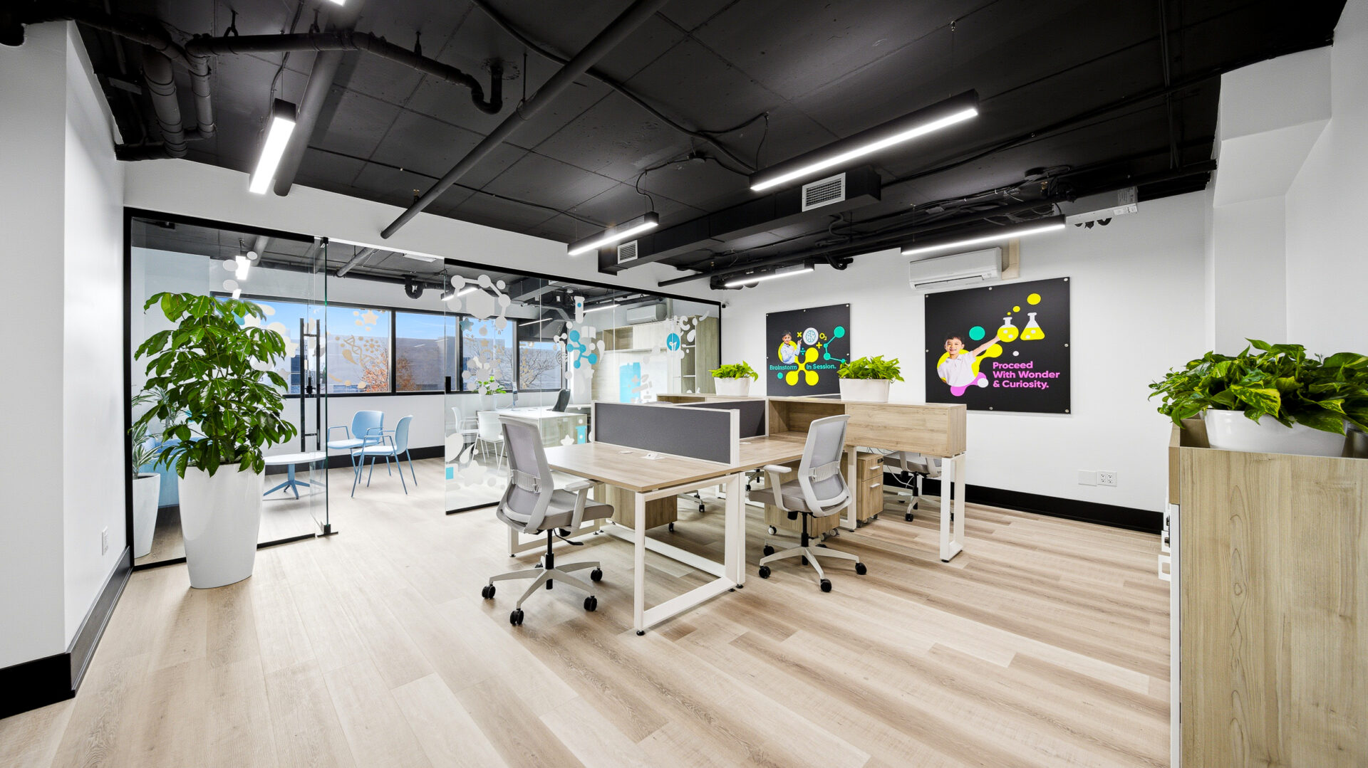 Unlike traditional classroom environments, STEMstein’s programming model required the space to support multiple modes of learning within a single open footprint. Instructor-led teaching, collaborative student work, laboratory experimentation, and staff administration all needed to occur seamlessly throughout the facility. The challenge was to create clearly defined functional zones while preserving open sightlines, strong supervision, and natural light.