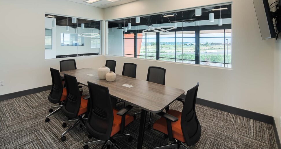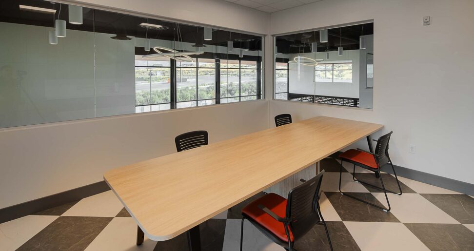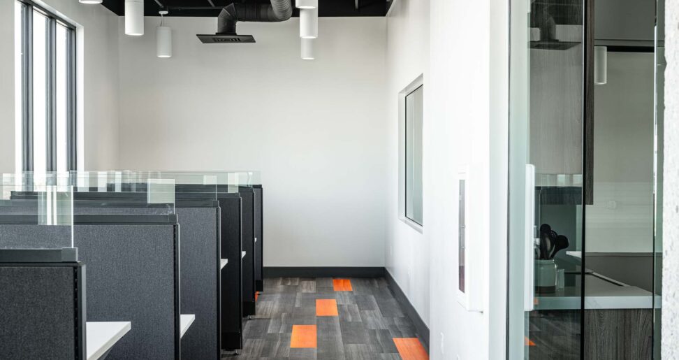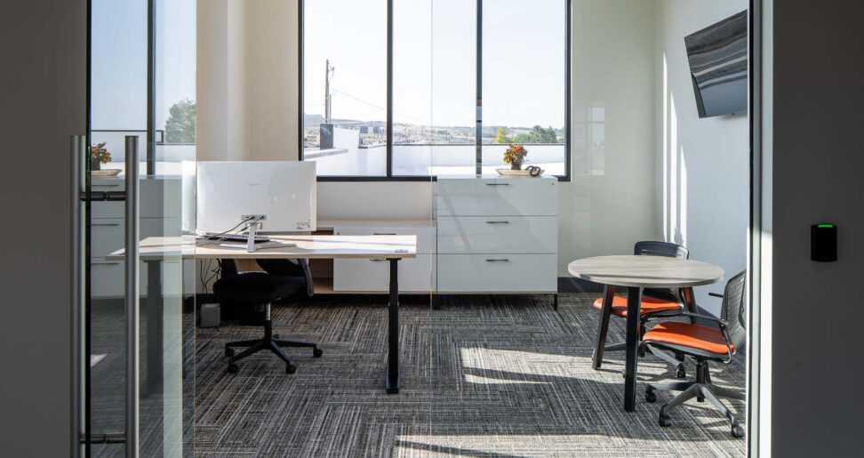Empire Flooring, a rapidly growing flooring and carpet installation company in Saratoga Springs, UT, collaborated with Tayco’s Dealer Main Street Office Furniture to design and furnish their new office space. The task was to create an environment that reflected the building’s modern aesthetic, featuring large glass windows and high ceilings, while ensuring the furniture was both functional and adaptable to their expanding Team. Empire required private offices, a breakroom, a conference room and open office cubicles. Additionally, they needed ample storage for their flooring samples and workstations that fostered collaboration, while still offering the functionality of a private office.