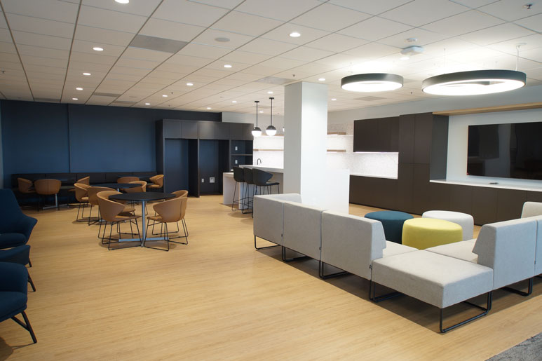 These workstations incorporated two-drawer under-desk credenzas also in White laminate, a cushion option added for additional seating space in sleek Nightfall fabric and a multipurpose tackboard in Stone Ballo for both privacy and display functionality. Furthermore, five Metro private offices in White laminate and vinyl accompanied by wall mounted hutches with sliding doors in Mojave laminate and matching vinyl were added for extra capacity.
