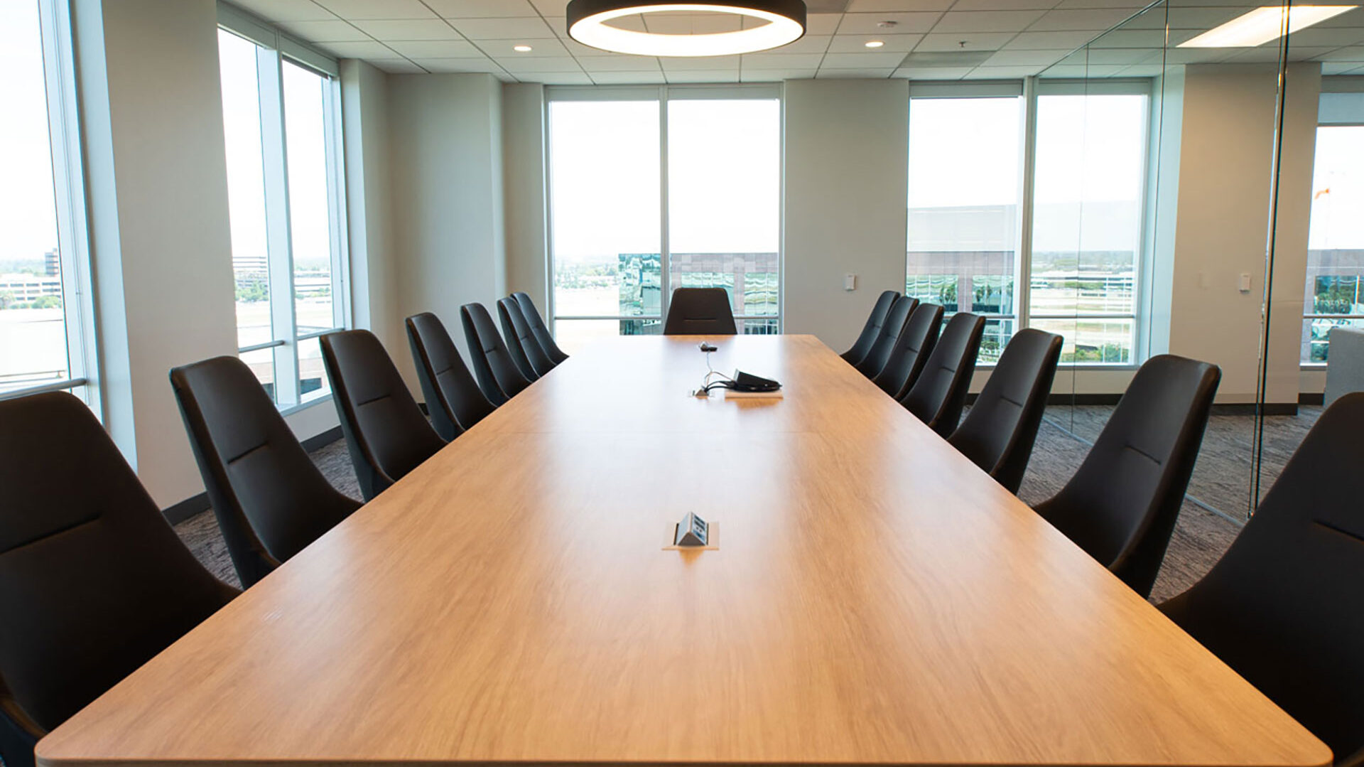In this project, a particularly remarkable area was the notable a large scenic boardroom, featuring an impressive Norris 240”W table, and offering an exceptional panoramic view of the airport. The finishes in this boardroom were specifically selected to enhance the natural environment. By utilizing Mojave vinyl and White metal details, it establishes an open and airy ambiance. This, coupled with the airport views fosters a relaxed atmosphere.