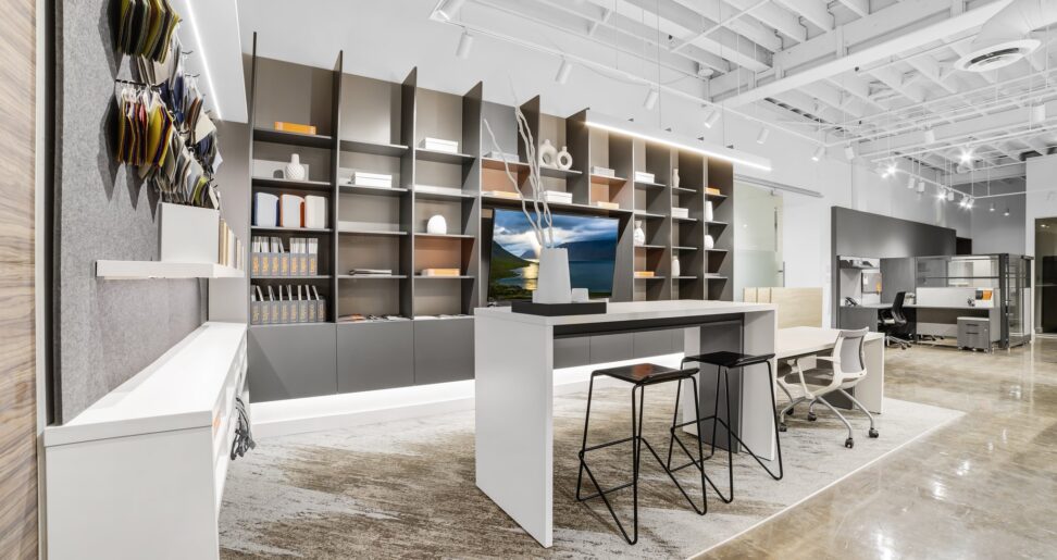 As with any major transformation, the team faced several key challenges—most notably, designing a workspace that effectively supports a hybrid work model. The primary focus was integrating touch down stations to provide Team members with the flexibility to work comfortably and productively during their time in the office. However, limited access to power required strategic planning, with workstations positioned along perimeter walls to leverage existing infrastructure. At the same time, the space needed to serve a dual purpose: meeting employee needs while showcasing Tayco’s full product offering in real-world, functional settings for Client visits.