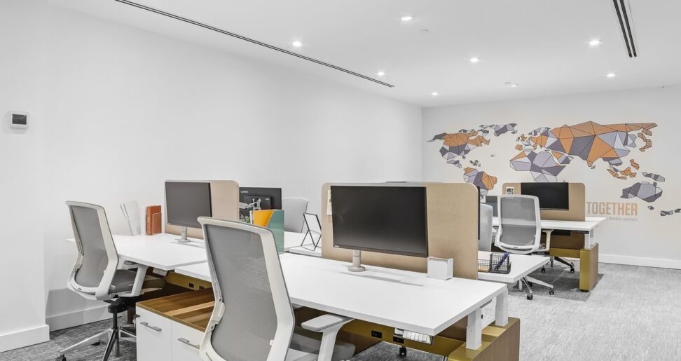 To support a hybrid work model, touch down stations with integrated storage were introduced, featuring Switch workstations in White laminate, White and Charcoal Linen Kubo Lockers, Halifax tables in White and Tofino laminate with Copper metal accents in desks, and mobile pedestals. The space also offered an ideal opportunity to showcase several of Tayco’s upcoming casegood solutions. Custom Switch benching stations, finished in warm Mojave laminate with COM Viviant fabric, were implemented to support flexible work styles and encourage informal collaboration. Despite the high-density layout, each workstation was thoughtfully arranged to promote flow, clarity, and comfort, providing employees with everything they need for a seamless hybrid experience.