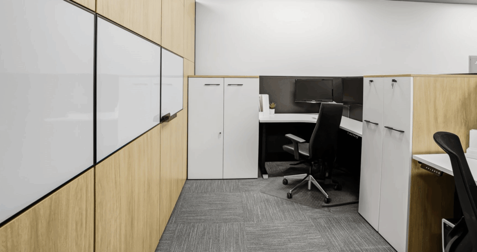 A major challenge was the limited availability of power, which was only accessible along perimeter walls. To address this, powered the Switch workstations had power within the raceway and then hard wired to wall infeeds, eliminating the need for ceiling or floor power. Along the same powered wall, alternating the Kubo Lockers were introduced to provide convenient storage while supporting the layout strategy.