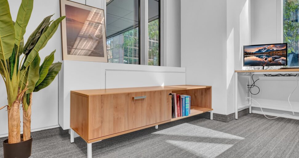 To encourage employees to return from home to the office, 22 private offices were thoughtfully curated and designed with a home-like feel, creating a welcoming environment. Using a combination of Halifax, Metro and custom items, each office demonstrated a feeling of individuality while also matching the office design. Freestanding desks and straight tables with modesty panels provided practical yet stylish work surfaces, while PET Felt Walls in Overcast offered sound-dampening and a modern touch. Storage needs were addressed with freestanding cabinets, low credenzas, and wardrobe cabinets with coat bars, ensuring employees had everything they needed within reach. An overall seamless aesthetic unified the entire office, with consistent finishes in Tofino melamine and vinyl used across all furniture, from reception to private offices. This cohesive design contributed to a calming, professional atmosphere that reflected the law firm’s values. The choice of neutral, serene colours helped maintain a collected environment while boosting morale and motivation. The result was a workspace that not only met functional needs but also enhanced employee satisfaction and added to the Client’s polished image.