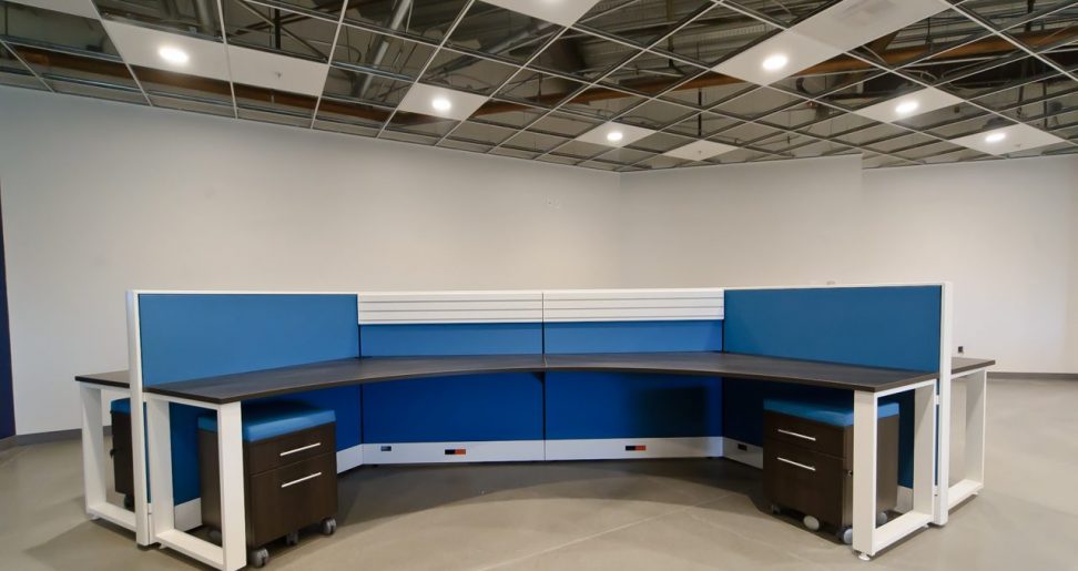 Les systèmes de Cosmopolitan ont été installés dans un arrangement de 120 degrés, pour permettre une importante saturation en lumière naturelle et une collaboration aisée au bureau de chaque travailleur. Les panneaux, choisis en bleu vif, offrent de l’intimité, tout en offrant l’aspect ouvert et moderne recherché dans nombre des milieux de travail aujourd’hui. Chaque poste a été enjolivé de pattes sur pignon blanches, d’une garniture de panneau et de rails accessoires. Les postes de travail ont également été munis d’un pied central mobile avec un coussin de siège bleu qui s’assortit aux couleurs des anneaux. Enfin, les branchements électriques ont été descendus du plafond au moyen des colonnettes de service Concourse, pour que tous les postes de travail soient électrifiés.