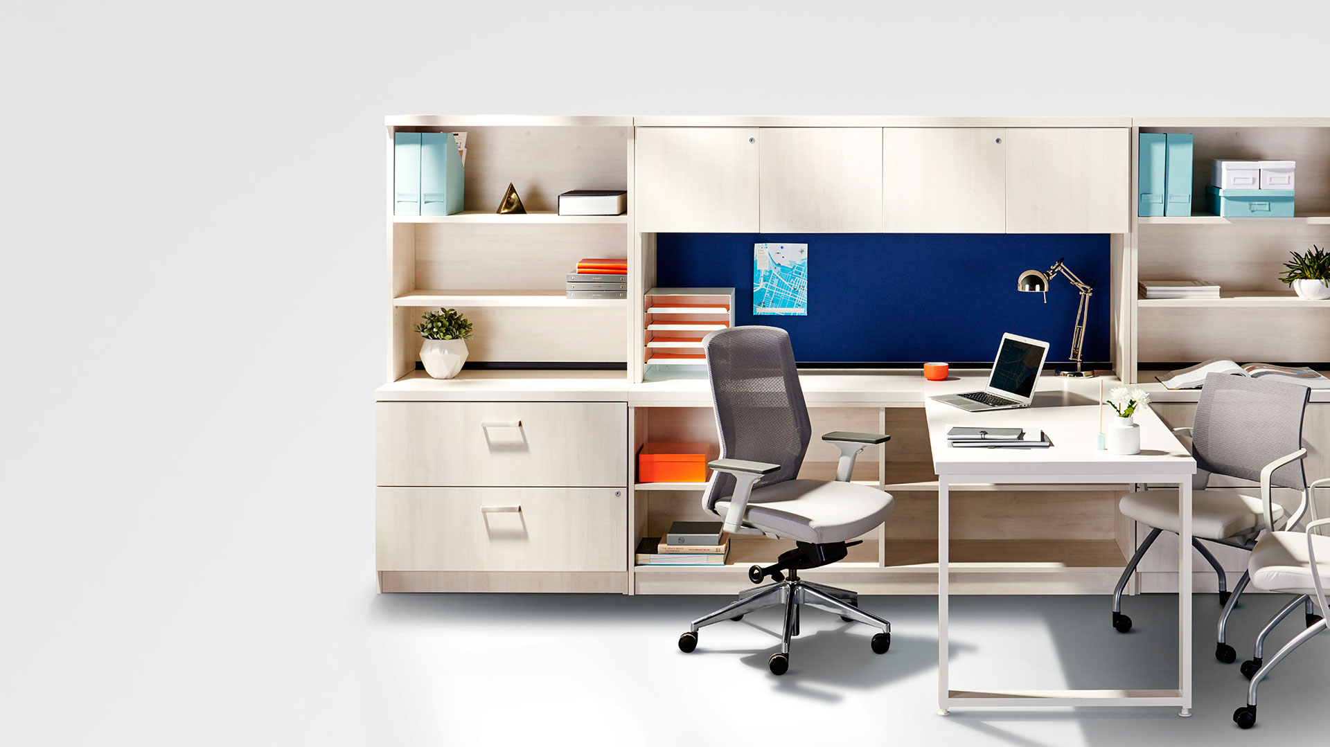 Scene looks the part too, with a range of features, from open frame gables to kickstand support legs, characterized by an envy-inducing minimal design aesthetic confident enough to call anywhere home. Flag storage provides an elegant solution to lateral privacy in benching. Height adjustable worksurfaces, pop-up power grommets and privacy screens with secondary organizational features transform ‘a workspace’ into ‘my workspace’.